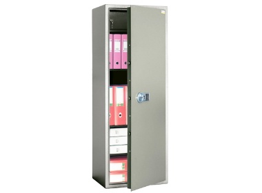 Изделие изготовлено из стали высокого качества с порошковым покрытием. Толщина боковых стенок составляет - 3 мм, а лицевой панели - 5 мм. Сейф оборудован электронным кодовым замком, с двухсторонней ригельной системой запирания и защитой от высверливания.