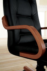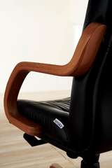 Кресло кожаное с деревянными подлокотниками. Высокая спинка.