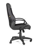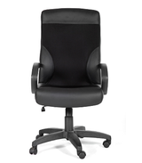 Большое и удобное кресло для руководителя с обивкой из экокожи, пластиковыми подлокотниками, и механизмом качания с возможностью фиксации кресла в рабочем положении, а также черной пластиковой крестовиной.
