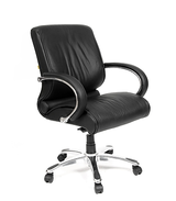 Кресло для руководителя премиум класса, с обивкой из натуральной кожи, металлическими подлокотниками и кожанными вставками на них, и механизмом качания повышенной комфортности с возможностью фиксации кресла в рабочем положении, а также хромированной металлической крестовиной с пластиковыми накладками для ног.