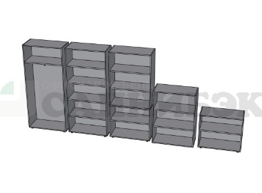 1) Толщина рабочих поверхностей из МДФ - 28мм. Толщина фасадов и порталов из МДФ – 19мм. Каркасы шкафов и тумб изготовленны из ДСтП и имеют толщину 18мм. Толщина полок из ДСтП во всех шкафах - 25мм.