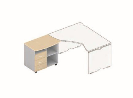 Приставная тумба МК R/L, размер 883х550х735, оснащена тремя выдвижными ящиками и нишами, устанавливается на 4 опоры-колеса, применяется совместно с криволинейными столами.