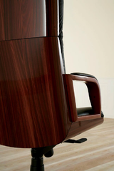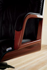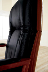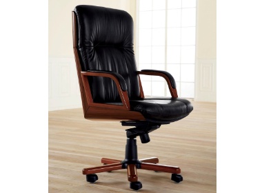 Кресло кожаное с деревянной отделкой спинки и сиденья. Подлокотники деревянные с декоративными вставками из кожи.