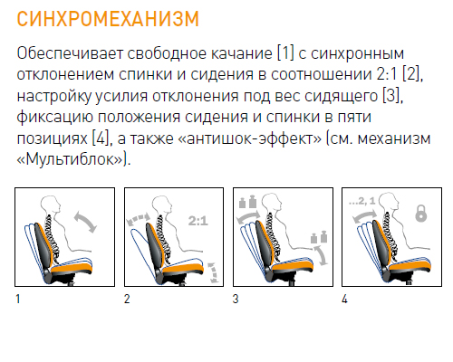 | Механизм качания | Механизм качания с синхронным отклонением сидения и спинки 1:3, с фиксацией кресла в нескольких положениях |