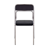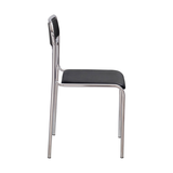Кресло с металлической рамой, сидение и спинка обиты мягким синтетическим материалом черного цвета.